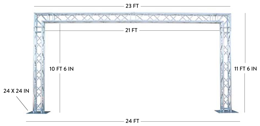 This 12x23 foot truss is excellent for hanging lights across the front of a stage or for hanging banners as a backdrop for your next trade booth. The lightweight aluminum has a very high tensile strength, giving you the support and stability you need and it is easy to assemble, requiring only a few tools to complete set up. $250 per day.